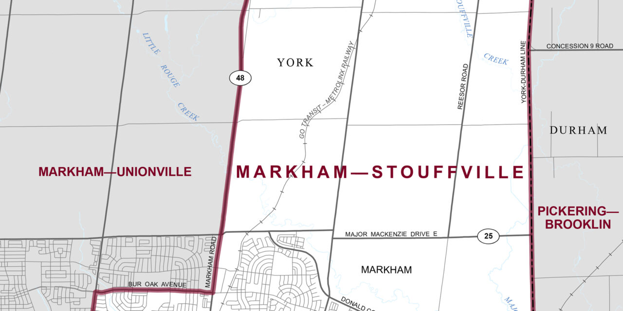 While much of the geographic area of Whitchurch-Stouffville has been moved into the new York–Durham riding, the bulk of the municipality’s population will continue voting in the Markham–Stouffville electoral district for federal elections.