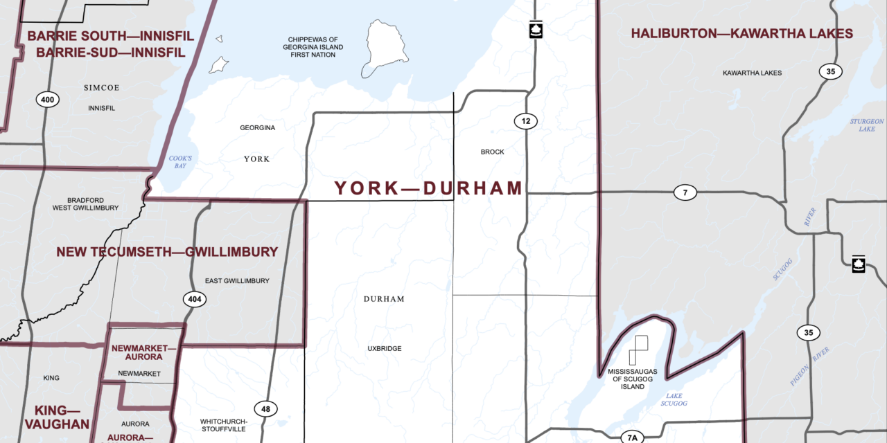 The newly formed York–Durham riding (map) unites rural Whitchurch–Stouffville with the Town of Georgina, the townships of Brock, Scugog, and Uxbridge, and the Chippewas of Georgina Island First Nation and Mississaugas of Scugog Island reserves. The district includes an estimated 96,869 eligible voters.